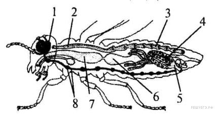 Версия для печати и копирования в MS WordУкажите, какими цифрами на рисунке внутреннего строения насекомого обозначены органы систем:
