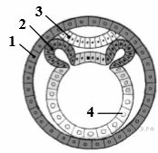 Укажите, из каких элементов нейрулы, обозначенных на рисунке цифрами 1—4, развиваются следующие структуры млекопитающих: