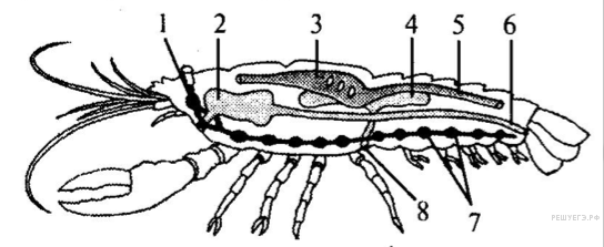 На схеме строения речного рака структурные элементы кровеносной системы обозначены цифрами: